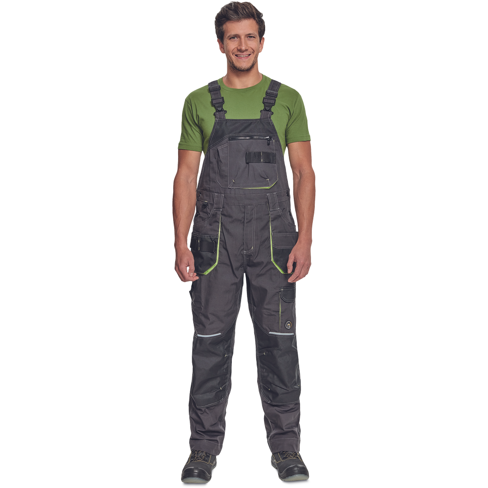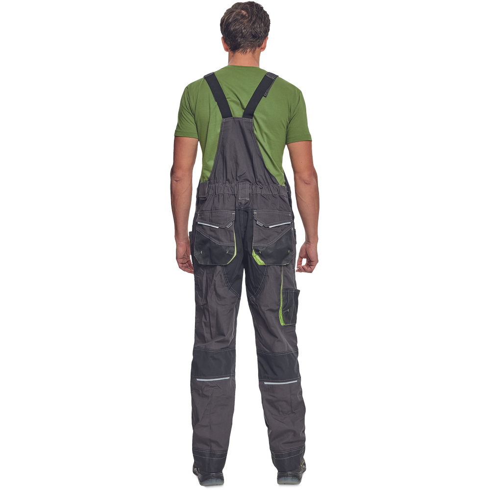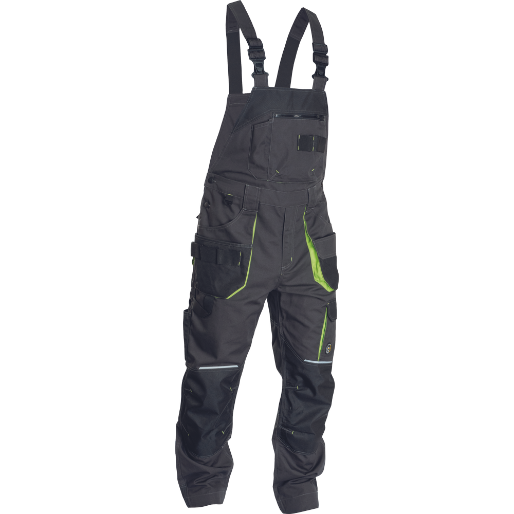 • pánské pracovní kalhoty s laclem, pružným pasem a multifunkcními kapsami • Oxford 600D zesílení kolenních kapes pro vkládání ochranných nákoleníku • odolné trojité prošití nohavic a sedu • reflexní prvky • nastavitelná délka nohavic