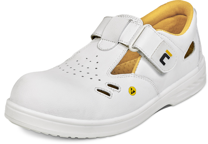 Bezpečnostní ESD sandál ze syntetického materiálu s vysokými mikroporézními vlastnostmi, kompozitní tužinkou. PU podrázkou rezistentní olejům s lepšími protiskluzovými parametry.