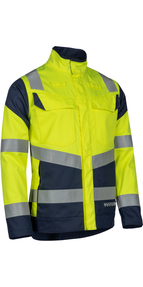 HI-VIS pánská bunda s ARC ochranou; je vyrobena z vysoce prodyšné a velmi lehké (260 g/m²) tkaniny s vynikajícími vlastnostmi regulující vlhkost; rovný límec; zapínání na skryté druky pod klopou; 2 našité náprsní kapsy s klopou zapínanou na skryté druky; 2 našité šikmé kapsy s klopou uzavrenou na skryté druky; 2 smycky pro detektory plynu; prodloužená záda; nehorlavé reflexní pruhy pres ramena, boky a rukávy