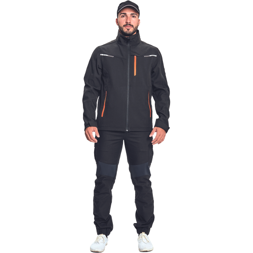 pánská softshellová bunda s membránou; postranní kapsy na zip v kontrastní barvě; 1 náprsní kapsa na zip v kontrastní barvě; nastavitelné manžety na suchý zip; nastavitelná spodní část bundy stahovací šňůrkou