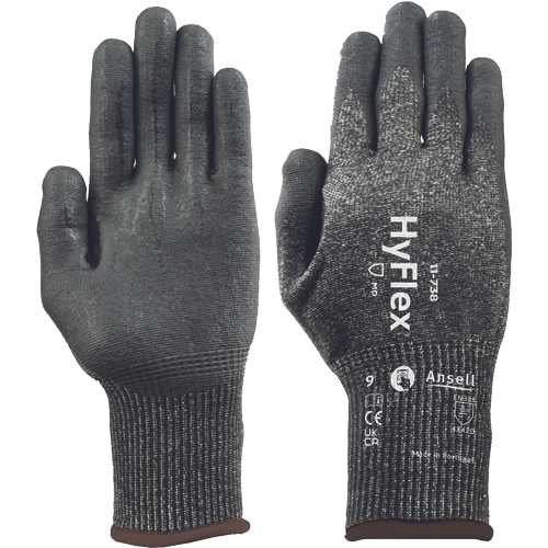 Vysoce odolné rukavice odolné proti proříznutí, se silnými směsovými vlákny a zesíleným rozkrokem palce. EN 388: 4X42D Zvýšená obranyschopnost: Příze INTERCEPT Cut Resistance Technology průmyslových rukavic HyFlex® 11-738, smíšená s nylonem, lycrou a zesílenými vlákny, zajišťuje vysokou odolnost proti proříznutí. Pokročilá odolnost: Technologie FORTIX™ odolná proti oděru zajišťuje dlouhotrvající životnost Cílená ochrana: Zesílený rozkrok palce bezpečnostních rukavic HyFlex® 11-738 zajišťuje 12x větší odolnost než u nezesílených konkurenčních rukavic. Zvýšený komfort: Polyuretanový a nitrilový povlak na vodní bázi zlepšuje přilnavost a zároveň zvyšuje pohodlí a obratnost. Certifikováno jako šetrné k pokožce a nezávadné: Jsou schváleny společností Dermatest®, neobsahují rozpouštědla a mají certifikát Oekotex®, že neobsahují škodlivé látky. Bez silikonu: Rukavice HyFlex® 11-738 PPE neobsahují silikon, což zabraňuje přenosu nečistot na kov před lakováním. Doporuč