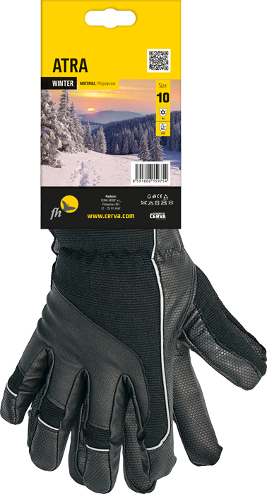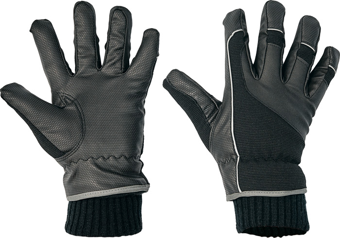 Zimní zateplené nepromokavé rukavice s prodyšnou membránou, dlaň polyester-PU, hřbet z pružného nylonového úpletu zesíleného PU koženkou. Podšívka v dlani polyester/bambus, na hřbetu polyesterový izolační materiál. Zateplení Thinsulate 40 g. Reflexní doplňky.