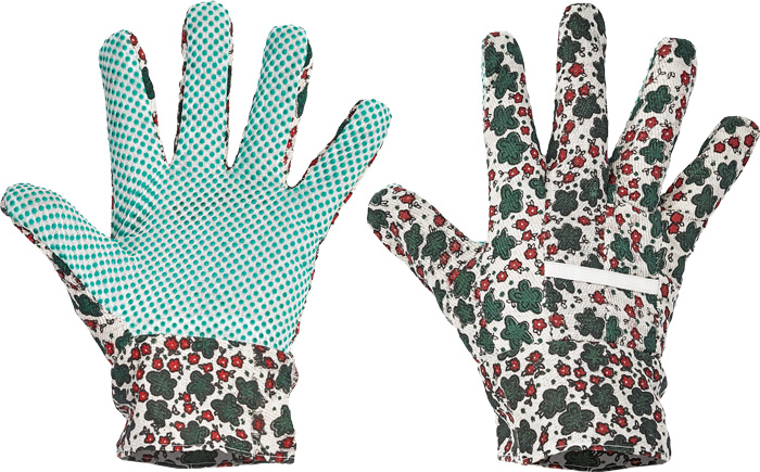 Rukavice šité z barevné bavlněné tkaniny, s PVC terčíky v dlani a na prstech.