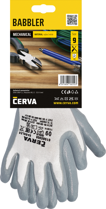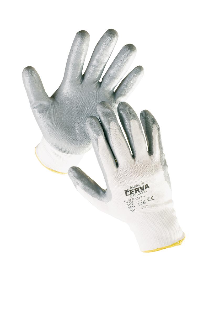 Pletené bezešvé nylonové rukavice s vrstvou mikroporézního nitrilu v dlani a na prstech a pružným nápletem.