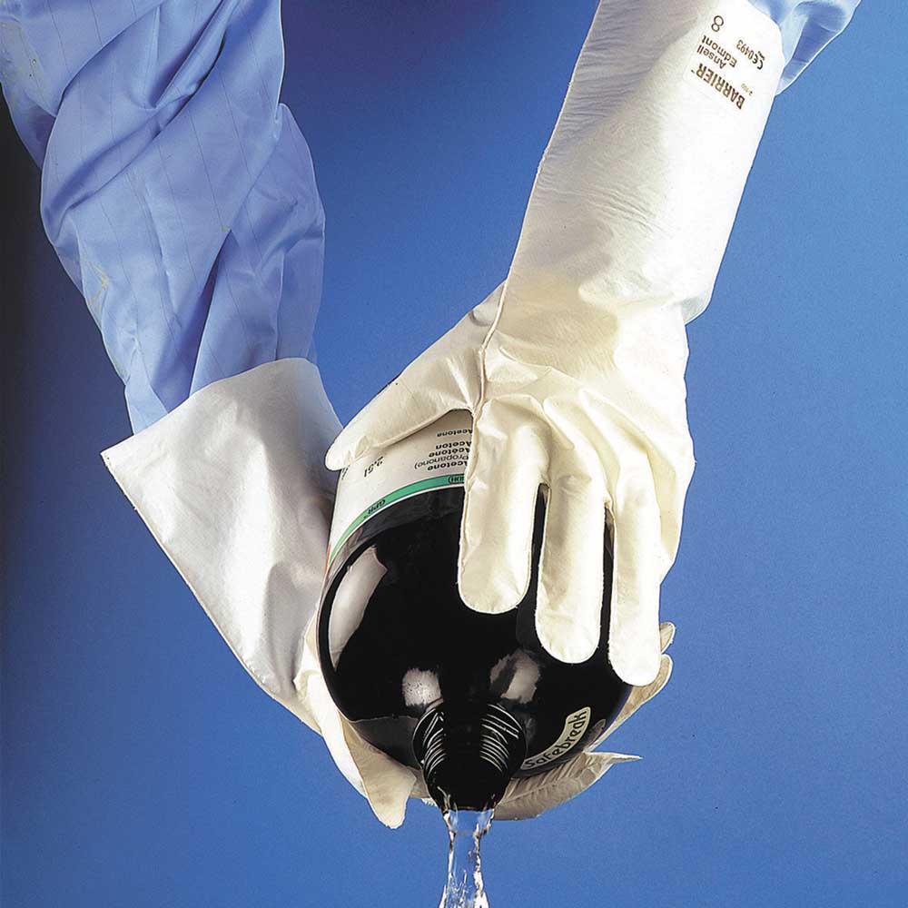 Svařené ergonomicky tvarované rukavice z pětivrstvé chemicky odolné fólie, s podšívkou z netkaného materiálu, odolností proti chemikáliím a rozpouštědlům, lze chránit PVC, nitrilovými nebo latexovými rukavicemi pro snížení mechanického rizika.