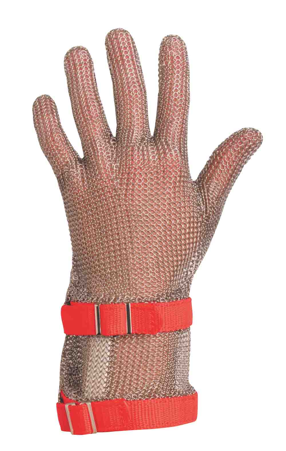 Rukavice z nerezových kroužků, s textilním stahovacím řemínkem, chráničem předloktí, maximální ochranou proti pořezání a 7,5 cm širokou manžetou. 0114 0002 99 080 červená, 0114 0002 99 090 modrá, 0114 0002 99 100 oranžová, 0114 0002 99 110 fialová