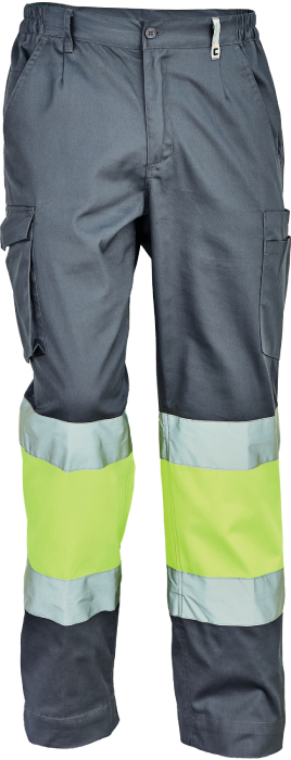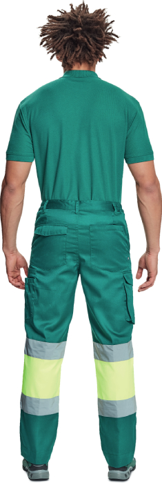 pánské pracovní kalhoty v kombinaci s Hi-Vis holenní částí s reflexními 7 cm pruhy, elastický pas, 2 postranní kapsy + 1 kapsička na drobné, 2 stehenní kapsy, 2 zadní kapsy, nastavitelná délka nohavic