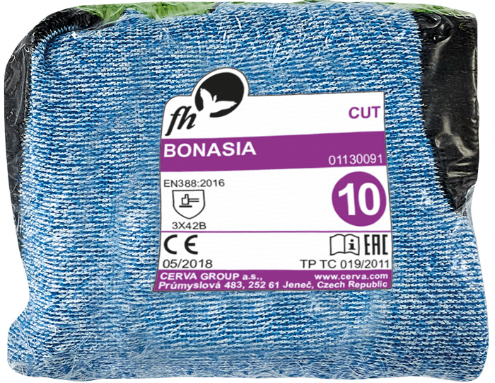 Pletené bezešvé rukavice kategorie prořezu B, PU na dlani a na prstech, pružná manžeta.