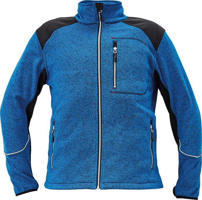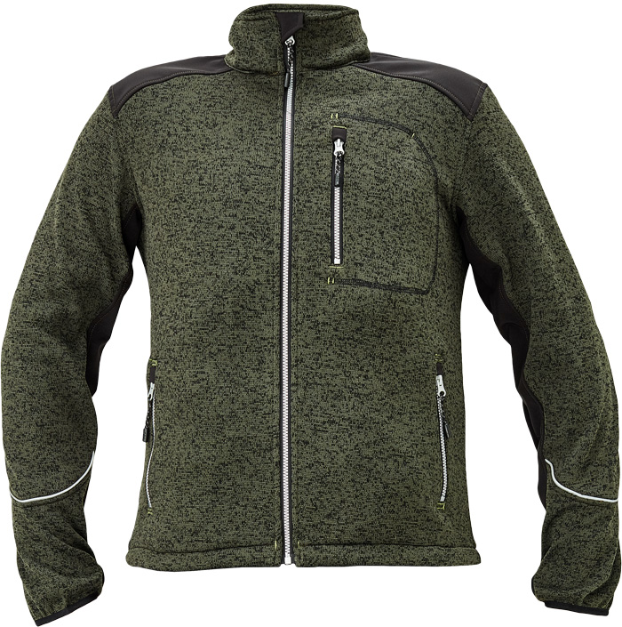 pánský celopropínací svetr z melírovaného úpletu uvnitř počesaná; zesílená část v oblasti ramen a rukávů sofsthellovým materiálem v kontrastní barvě; 1 náprsní kapsa na zip; 2 postranní kapsy na zip; nastavitelná šíře spodního obvodu; dekorativní reflexní paspulka na rukávu, očko na palec