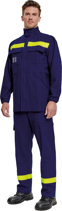 multinormní bunda se stojatým límcem a zapínáním na zip kryté légou; 2 náprsní kapsy s klopou na druky; 2 boční kapsy na zip; reflexní pruhy na zádech a přes hrudník; elastické manžety rukávů.