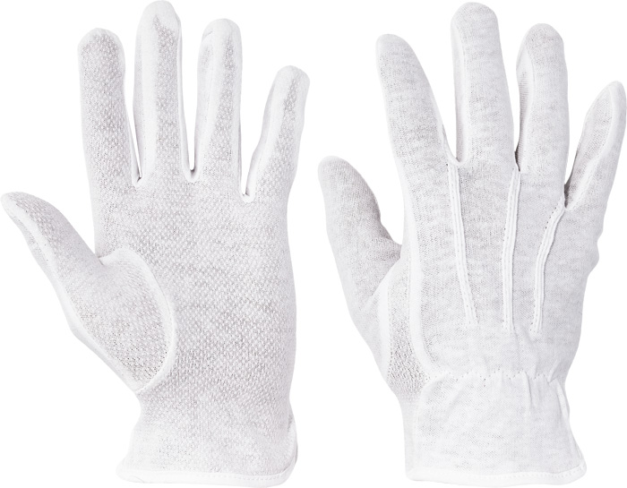 Rukavice šité z bavlněného úpletu, s PVC terčíky v dlani a na prstech, pružinkou na horní části zápěstí, bez manžety.