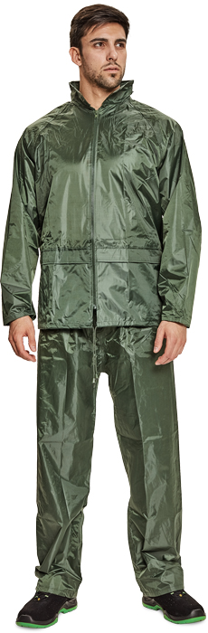 • dvoudílný voděodolný oblek s kapucí • ¾ plášť s integrovanou kapucí v límci a kalhoty v pase do gumy • dvě přední široké kapsy kryté légami proti průniku vody • spodní část rukávů lze regulovat drukem • ventilace na zádech a v podpaží • transportní obal