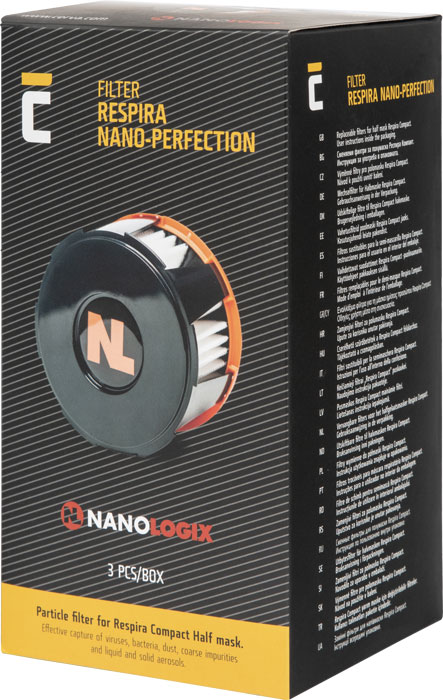 Možnost sterilizace filtru až 5x, a to buď ponořením v 60% roztoku alkoholu nebo teplotou 80°C po dobu 20ti minut nebo ozónem nebo UV. Nejmenší vir 200 nanometrů, nanofiltry zachytí částici o velikosti 50 nanometrů. Mnohem delší životnost, díky použitému nanofiltračnímu materiálu a jednomu nádechovému a výdechovému ventilu je živostno filtru přibližně 4x delší, než u běžných filtračních materiálů polomasek a celoobličejových masek. Balení obsahuje 3 filtry.