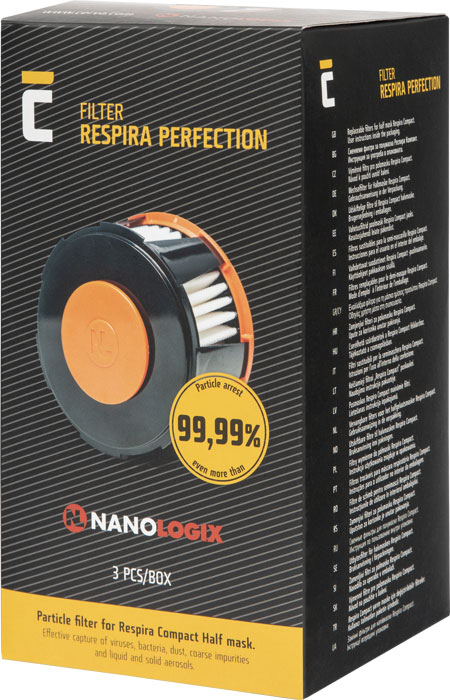 Možnost sterilizace filtru až 5x, a to buď ponořením v 60% roztoku alkoholu nebo teplotou 80°C po dobu 20ti minut nebo ozónem nebo UV. Nejmenší vir 200 nanometrů, nanofiltry zachytí částici o velikosti 50 nanometrů. Mnohem delší životnost, díky použitému nanofiltračnímu materiálu a jednomu nádechovému a výdechovému ventilu je živostno filtru přibližně 4x delší, než u běžných filtračních materiálů polomasek a celoobličejových masek. Balení obsahuje 3 filtry.