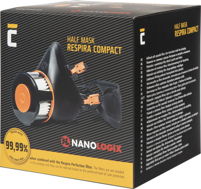 Polomaska s výměnnými filtry. V kombinaci s filtrem Respira Perfection částicový záchyt i více než 99 ,99 %. Tento produkt neobsahuje žádné složky přírodního kaučukového latexu. Polomaska Respira Compact s P3 filtrem byla testována ve vojenském Centru biologické ochrany Těchonín proti zvláště nebezpečným chorobám klasifikovaným jako úroveň biologické bezpečnosti 3 (BSL 3), jako je korejská hemoragická horečka, tyfus, HIV, tuberkulóza a antrax a BSL 4 nemoci, jako jsou SARS, horečka Lassa, neštovice a ebola. Balení obsahuje pouze polomasku.