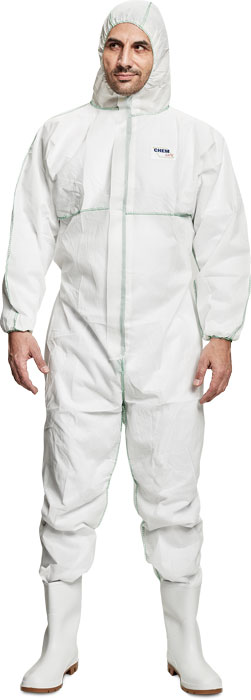 Ochranná kombinéza s kapucí a klopou na zipu a gumičkou stahovatelnými rukávy a nohavicemi, je odolná některým chemikáliím a průniku radioaktivních částic, patří do kategorie CE III, typu 5 a 6.