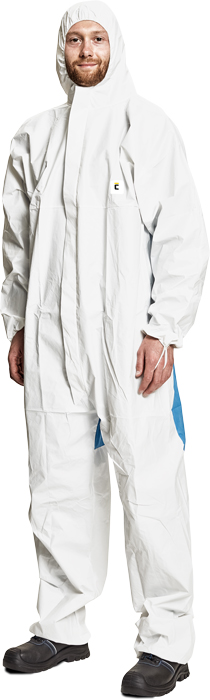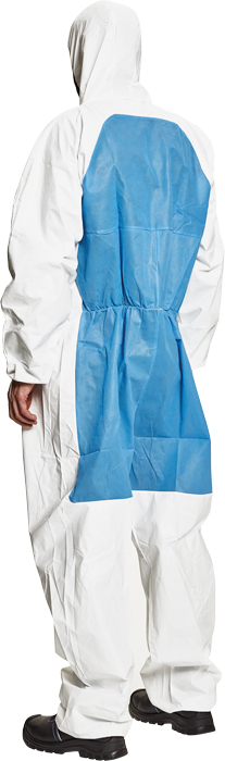 ochranná antistatická kombinéza s kapucí; přední materiál je vyroben s mikroporézní paropropustné vrstvy, zadní panely v modré barvě jsou z materiálu SMMS, který je neuveřitelně prodyšný; prodyšnost výrazně zlepšuje komfort pro uživatele při práci; na konci manžet jsou umístěny poutka na palce, aby rukávy vždy perfektně seděly na rukou, elastické okraje rukávů i nohavic