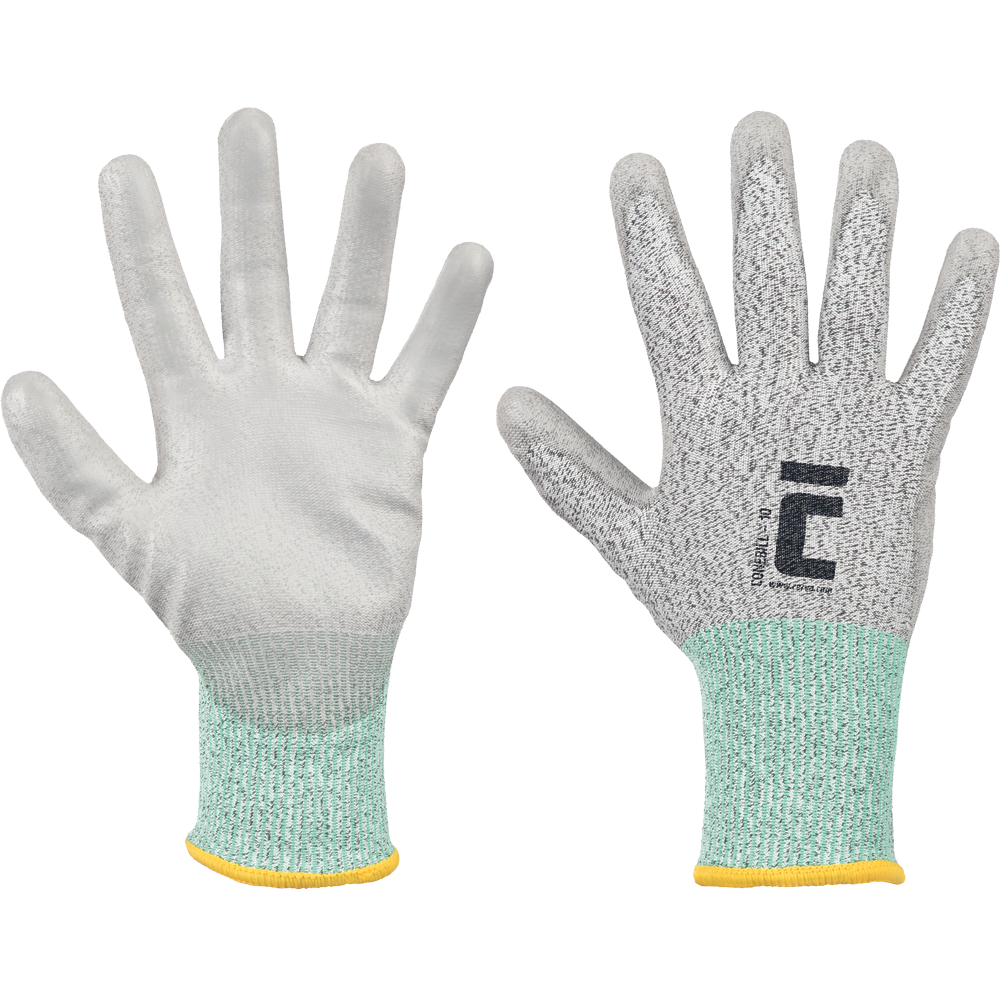 • pletené bezešvé rukavice • kategorie prorezu C • šedý PU na dlani a prstech