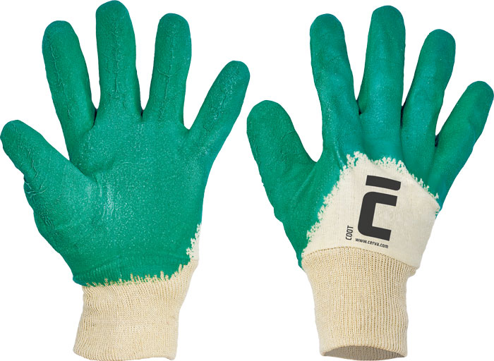 Rukavice šité z bavlněného úpletu, s protiskluzovým povrchem, pružným nápletem na zápěstí a máčenými dlaněmi a prsty v kaučuku.