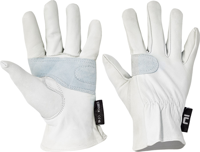 Celokožené rukavice odolné mechanickýcm rizikům ze silné kozinky a pěnovým vyztužením v dlani.