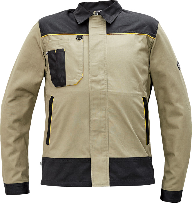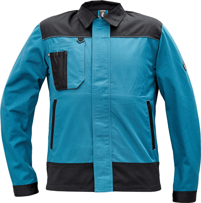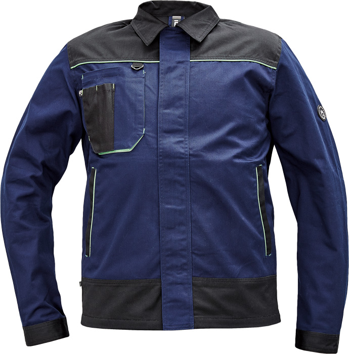 pánská pracovní bunda, materiál s vysokým procentem bavlněného podílu, moderní střih, zesílená oblast ramen materiálem Oxford, 2 boční lištové kapsy, 1 multifunkční náprsní kapsa, kontrastní paspulky, nastavitelná šíře rukávu na suchý zip, "D" kroužek