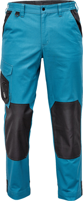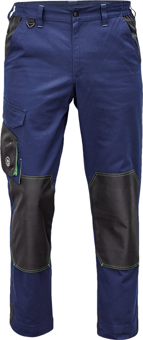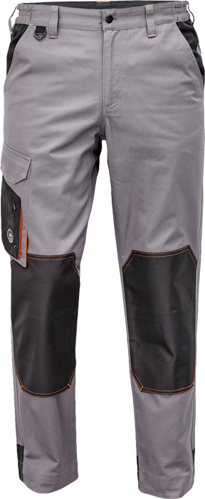 pánské pracovní kalhoty, materiál s vysokým procentem bavlněného podílu, moderní relax střih, elastický pas, zesílená oblast kolen materiálem Oxford s možností vkládání kolenních výztuh, 2 boční kapsy, 1 multifunkční kapsa na nohavici, 1 zadní kapsa se zapínáním na suchý zip, "D" kroužek, kontrastní paspulky, nastavitelná délka nohavic