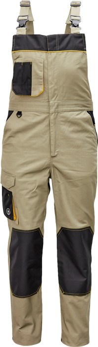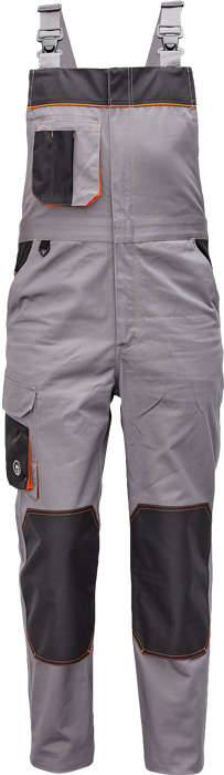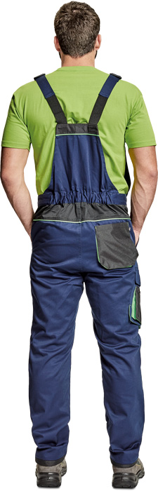 pánské pracovní kalhoty s laclem, materiál s vysokým procentem bavlněného podílu, moderní relax střih, elastický pas, zesílená oblast kolen materiálem Oxford s možností vkládání kolenních výztuh, 2 boční kapsy, 1 multifunkční kapsa na nohavici, 1 zadní kapsa se zapínáním na suchý zip, 1 náprsní multifunkční kapsa, "D" kroužek, dvoucestný zip, kontrastní paspulky, nastavitelná délka nohavic