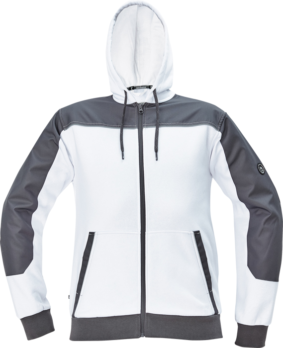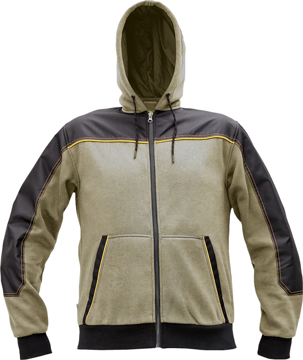 pánská celopropínací mikina na zip s kapucí, kvalitní počesaný výplněk, zesílená oblast ramen a loktů z materiálu Oxford, 2 přední klokaní kapsy, kontrastní paspulky, elastické žebrované náplety na rukávech a spodním obvodu, poutka na přichycení do Cremorne zimní bundy