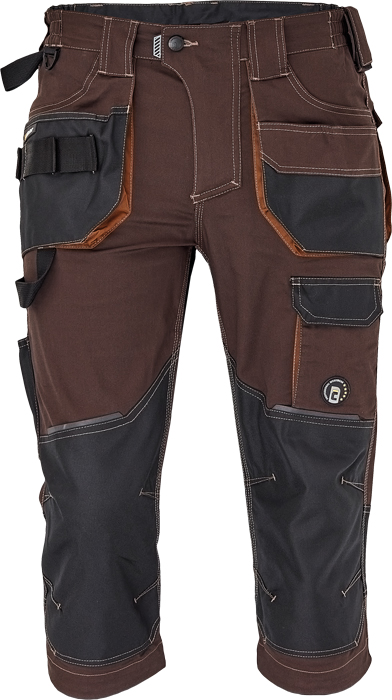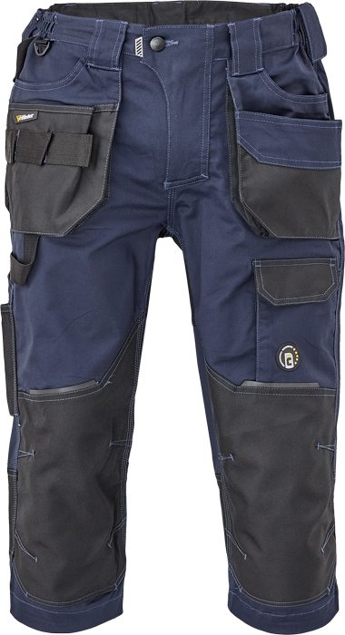 pánské pracovní 3/4 kalhoty, elastický inovativní materiál TRIFIBETEX®, ergonomický střih, snížený pružný pas, odolné trojité prošití nohavic a sedu, zesílená oblast kolen s možností vkládání kolenních výztuh, prostorné multifunkční přední kapsy s poutky na nářadí, 2 zadní kapsy s klopou zesílené Oxfordem, stehenní kapsa na telefon s klopou a zapínáním na suchý zip, kapsa na metr a nůž, poutko na kladivo, "D" kroužek, poutko na nářadí v pase, originální zpracování zapínání kalhot, reflektivní prvky v barevném odstínu