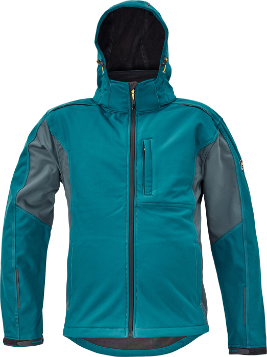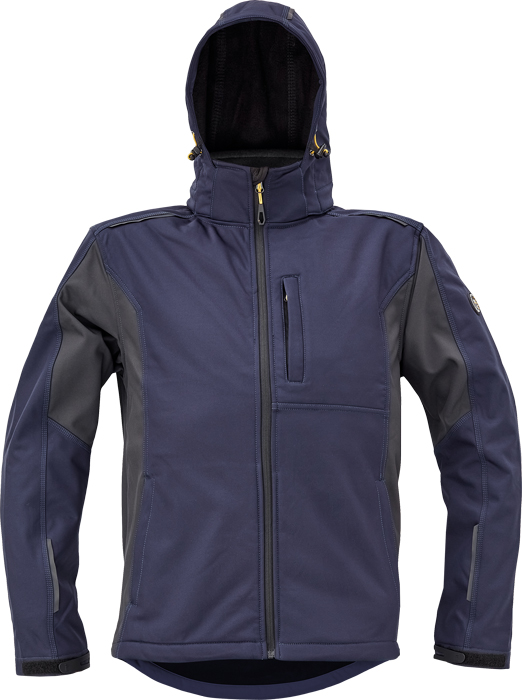 pánská softshellová bunda, ergonomický střih, odnímatelná kapuce, 3 přední kapsy na zip, 2 vnitřní kapsy, reflektivní prvky v barevném odstínu, nastavitelná šíře rukávu plastovým suchým zipem, stahovací šňůrka s brzdičkou ve spodním obvodu