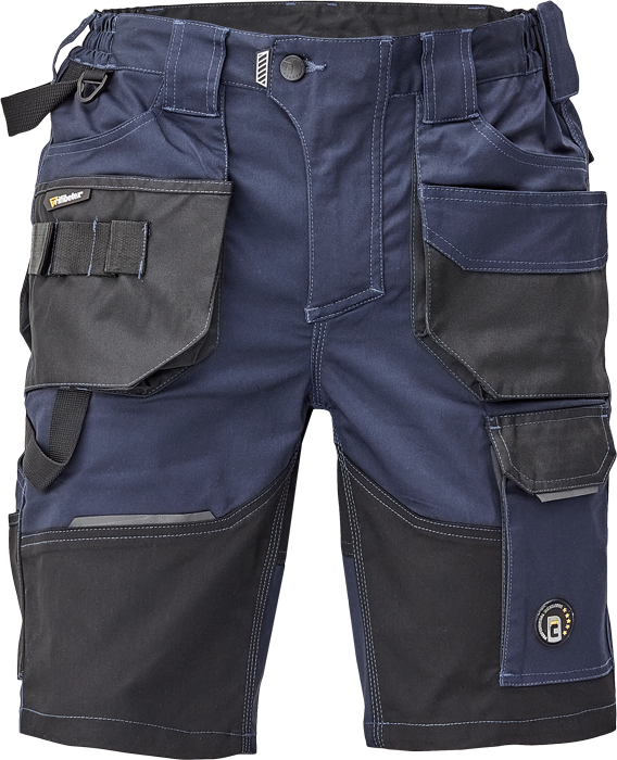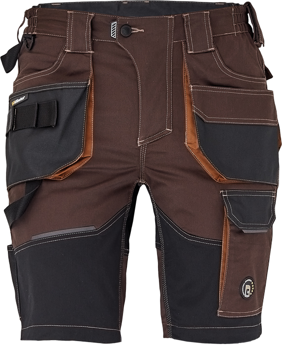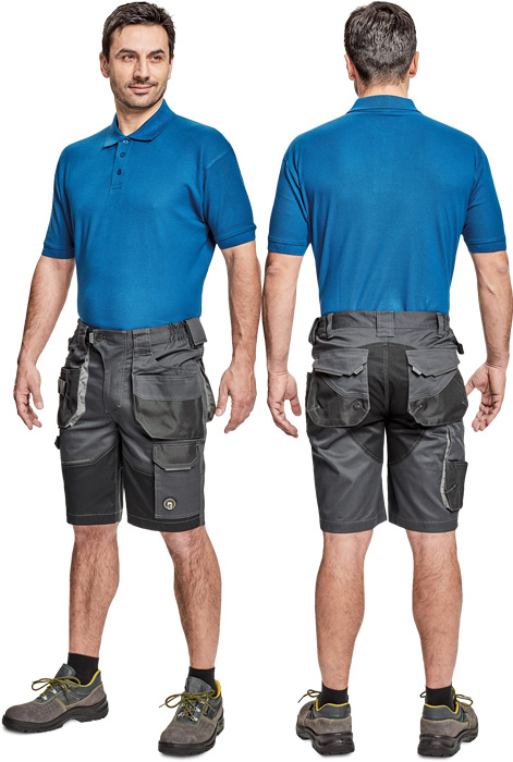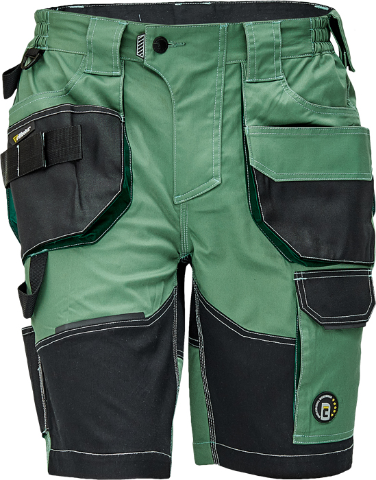 pánské pracovní šortky, elastický inovativní materiál TRIFIBETEX®, ergonomický střih, snížený pružný pas, odolné trojité prošití nohavic a sedu, prostorné multifunkční přední kapsy s poutky na nářadí, 2 zadní kapsy s klopou zesílené Oxfordem, stehenní kapsa na telefon s klopou a zapínáním na suchý zip, kapsa na metr a nůž, poutko na kladivo, "D" kroužek, poutko na nářadí v pase, originální zpracování zapínání kalhot, reflektivní prvky v barevném odstínu