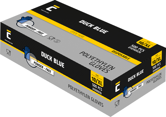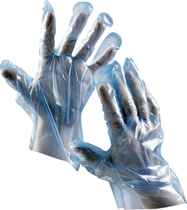 Jednorázové rukavice z polyetylénové fólie vhodné pro krátkodobý styk s potravinami.