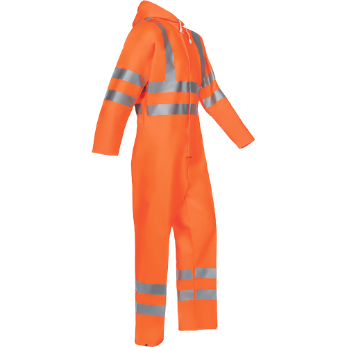HI-VIS kombinéza s pevnou kapucí; zapínání na zip překryté klopou na druky; elastická záda a pas; manžety v rukávech; zatavené švy; spodní lemy nohavic se zapínáním na druky.
