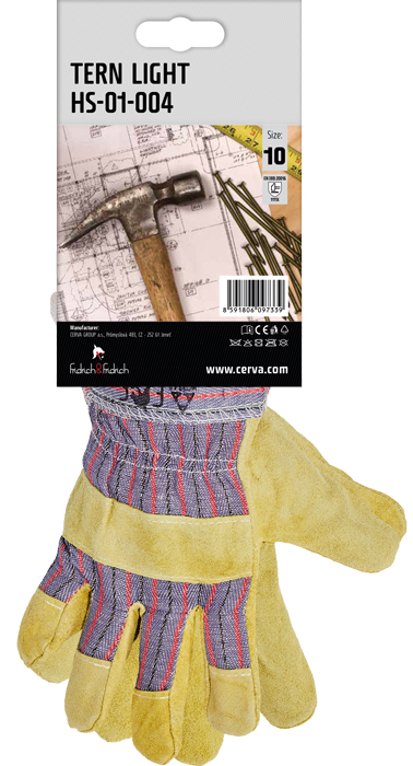 Rukavice z hovězí štípenky v dlani s podšívkou, hřbet a manžeta z bavlněné tkaniny.