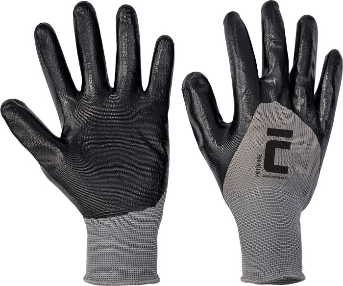Pletené bezešvé ruklavice máčené do 3/4 v černém nitrilu na dlani a prstech, pružný náplet.