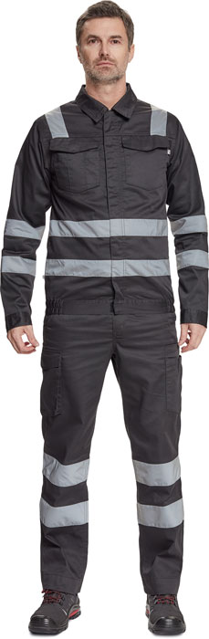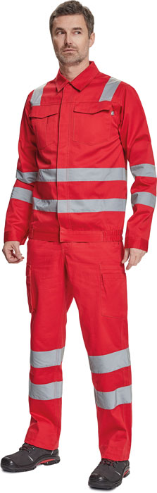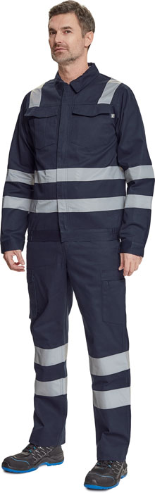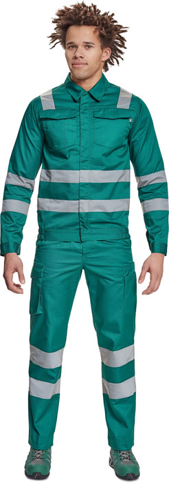 pánská pracovní bunda s retroreflexními pruhy přes ramena, v bocích a na rukávech, zapínání na zip kryté légou na suchý zip, 2 náprsní kapsy s klopou, elastický lem v bocích, nastavitelná šířka rukávů pomocí suchého zipu