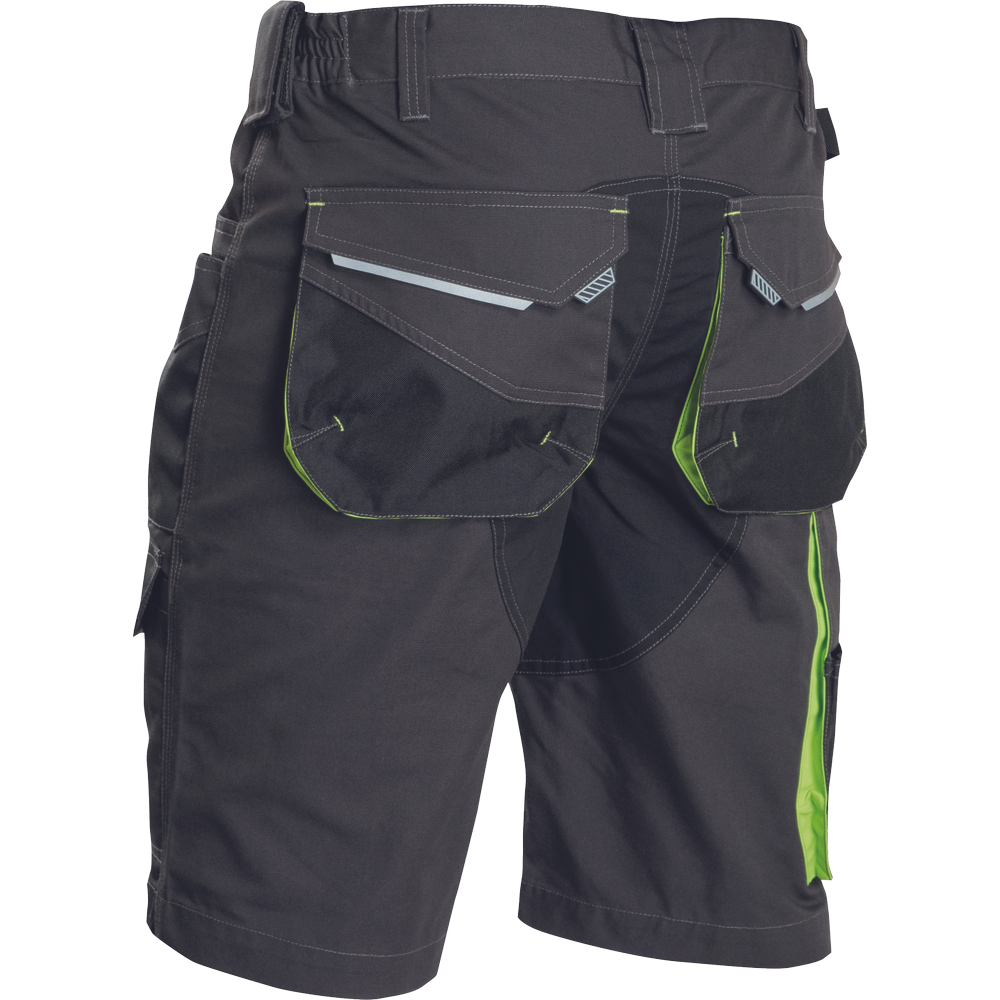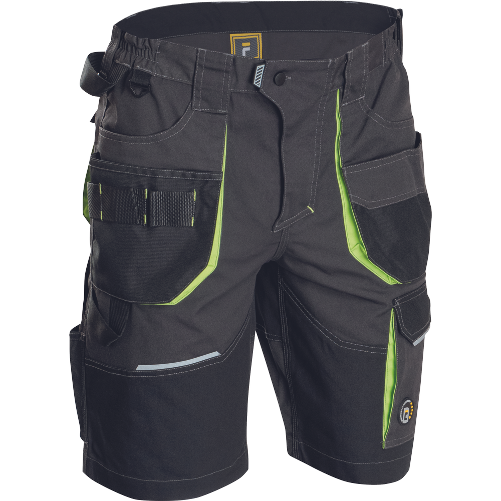 • pánské pracovní šortky s pružným pasem a multifunkcními kapsami • Oxford 600D zesílení v oblasti stehen • odolné trojité prošití nohavic a sedu • reflexní prvky