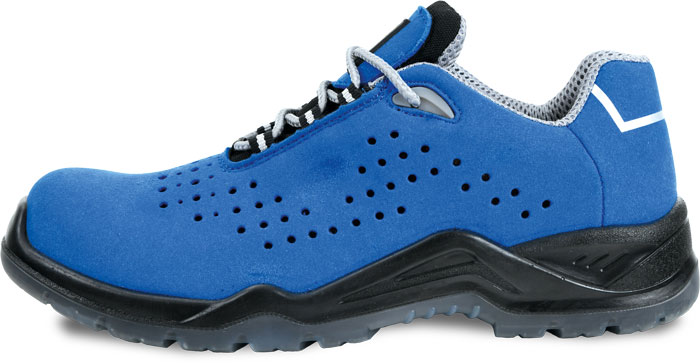 Bezpečnostní polobotka v moderní modro-černé barevné kombinaci. Svršek obuvi je vyrobený z mikrovlákna a perforovaný po cele délce. Protiskluzová podešev odolná olejům je vyrobena z polyuretanu a transparentního termopolyuretanu. Podešev zajišťuje nejenom komfort, ale také maximální jistotu při každém kroku. Obuv je vybavena komfortní, perforovanou vnitřní stélkou, která garantuje pohodlí a cirkulaci vzduchu uvnitř boty. Absorpce energie v oblasti paty tlumí nárazy a omezuje pocit únavy nohou. Díky bezpečnostní kompozitní tužince obuv splňuje požadavky normy EN ISO 20345:2011. To znamená, že chodidla jsou chráněna před stlačením silou do 15 kN nebo pádem břemena o vaze do 20kg z výšky 1m. Chodidla jsou chráněna také ze spodu, a to díky kompozitní stélce, proti propichu. Obuv neobsahuje kovové součásti a je vybavena funkcí ESD. Proto je to ideální model pro vnitřní prostory a citlivé prostředí, kde je potřeba zabránit vzniku jisker z elektrostatického výboje anebo pro prostory vybavené