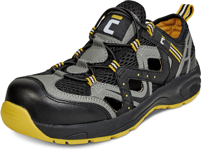 Bezpečnostní sandál s kompozitní tužinkou. Podešev -Phylon/Guma. Svršek je vyroben v kombinaci kůže a prodyšné síťoviny. Žluté doplňky zvyšují viditelnost uživatele.