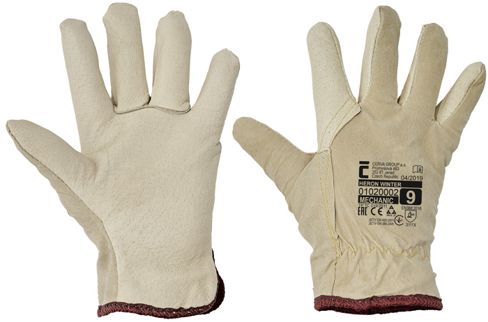 Celokožené rukavice z vepřové lícovky v dlani, vepřové štípenky na hřbetu, s teplou podšívkou.