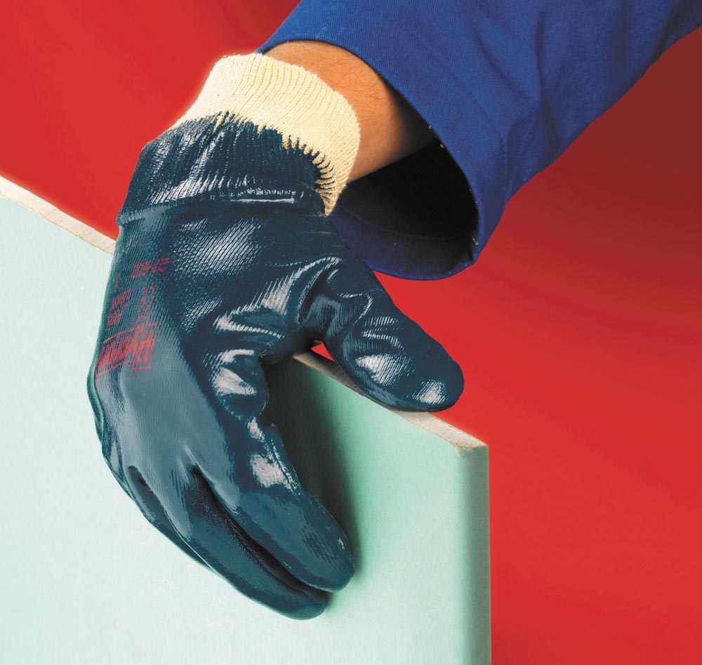 Antistatické rukavice šité z bavlněného úpletu, máčené v nitrilu, s pružným nápletem, vhodné pro manipulaci s abrazivními materiály (odlitky, svářková ocel, cihly apod.).