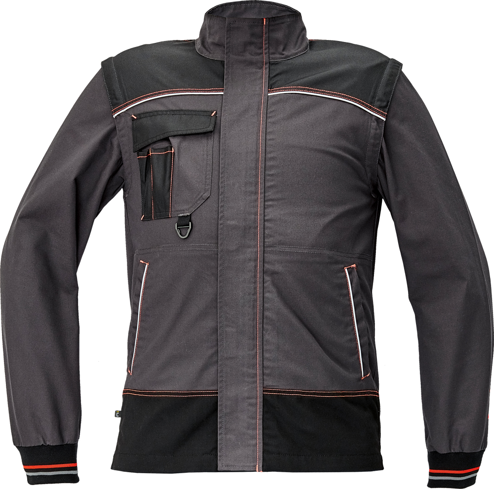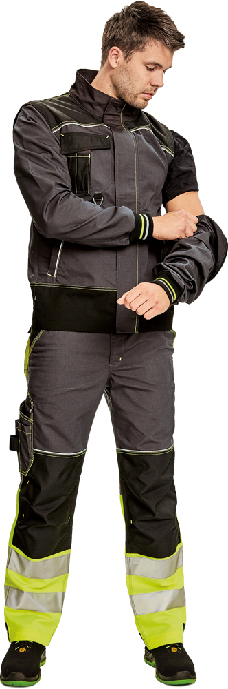 • pánská pracovní bunda moderního střihu se stojáčkem • hluboké postranní kapsy • multifunkční náprsní kapsa • D kroužek pro přichycení identifikační karty • zesílená oblast ramen • náplety na rukávech • prošití kontrastní nití v hi-vis barevném odstínu