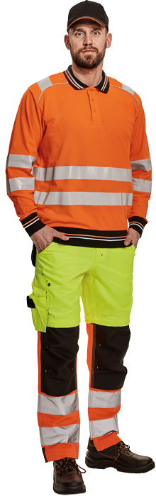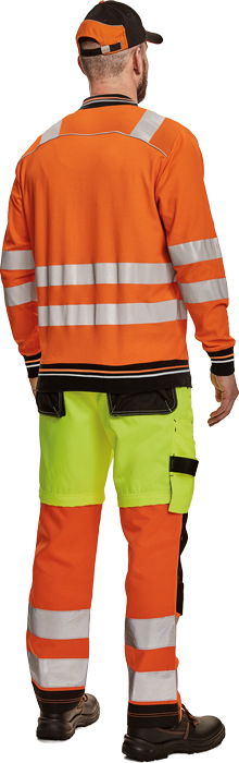 pánská HI-VIS mikina s límečkem z počesaného výplňku směsi polyesteru a bavlny; propínací léga na 3 knoflíky; kontrastní proužky v nápletech rukávů a spodním lemu; dvojice reflexních pruhů po obvodu pasu a rukávů a přes ramena; dekorativní prošití v HI-VIS barvě.