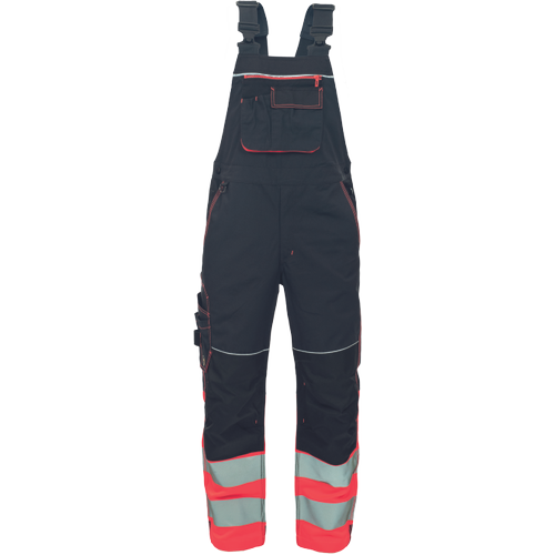 pánské pracovní kalhoty s laclem v kombinaci s HI-VIS spodní částí nohavic; dvojice tištěných 7,5 cm reflexních pruhů; elastický pas; 6 funkčních kapes; 600D Oxford zesílení v oblasti kolen s možností vkládání kolenních výztuh; dekorativní prošití v kontrastní HI-VIS barvě; nastavitelné délka nohavic.