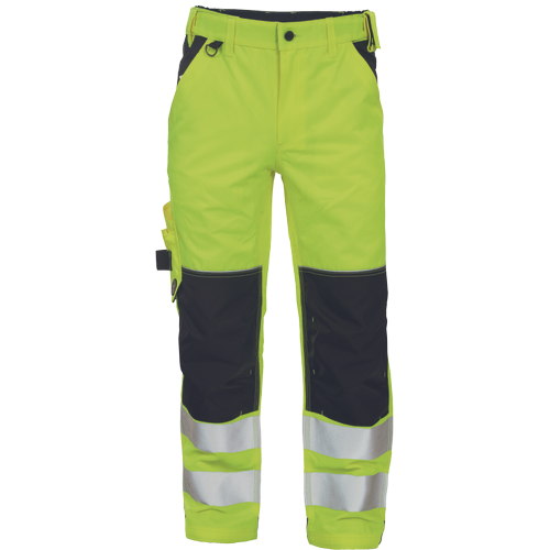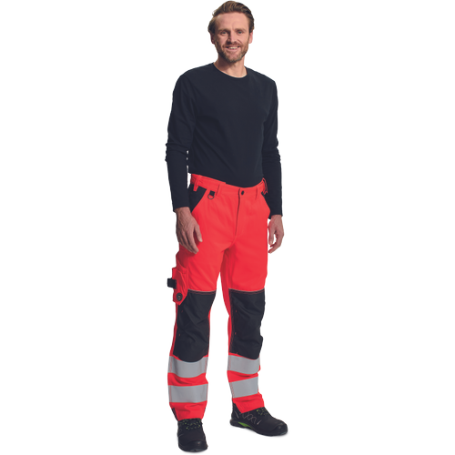 pánské HI-VIS pracovní kalhoty s elastickým pasem; dvojice tištěných 7,5 cm reflexních pruhů; 5 funkčních kapes; 600D Oxford zesílení v oblasti kolen s možností vkládání kolenních výztuh; dekorativní prošití v kontrastní HI-VIS barvě; nastavitelné délka nohavic.
