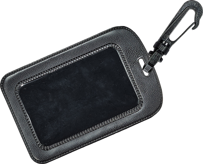 obal na identifikační kartu s karabinou; rozměr karty 5,5 cm × 8,5 cm