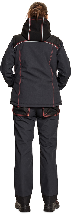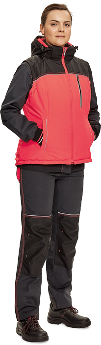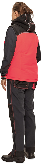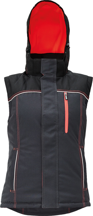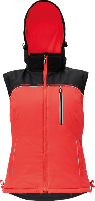 dámská oboustranná zateplená vesta s odnímatelnou kapucí vhodnou pro obě verze nošení vesty; jedna strana v hi-vis provedení; zesílená oblast ramen; náprsní kapsa na zip a 2 postranní lištové kapsy; lemování sedla a kapes reflexní paspulkou; dvojitá kapuce s kontrastním hi-vis úpletem v barvě dekorativního kontrastního prošití; nastavitelná šířka spodního obvodu a obvod kapuce