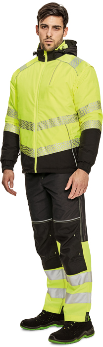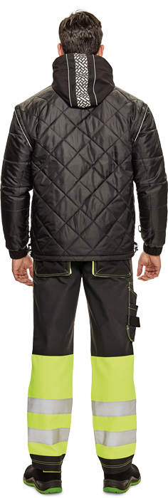 pánská oboustranná zateplená bunda 4 v 1 s odepínacími rukávy a kapucí; hi-vis verze se segmentovanými reflexními pruhy a reflexními paspulkami; 2 postranní kapsy na zip; 1 náprsní kapsa na zip; nastavitelná šíře spodního obvodu pomocí stahovací šňůrky; zip krytý légou; obrácená verze v černé barvě s kontrastními reflexními paspulkami