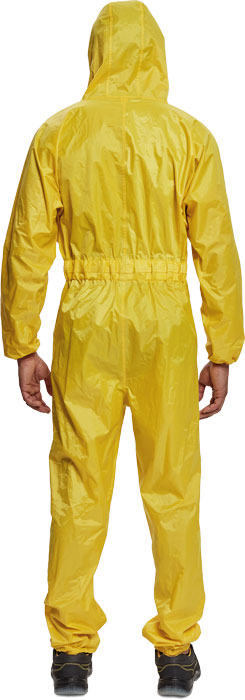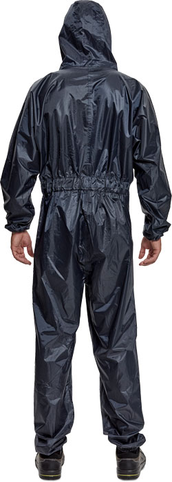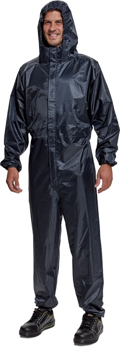 voděodolný overal s kapucí; přední zapínání na zip kryté klopou na suchý zip; overal má přelepené švy; elastický pas, lemy rukávů, nohavic a kapuce na gumičku.