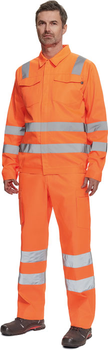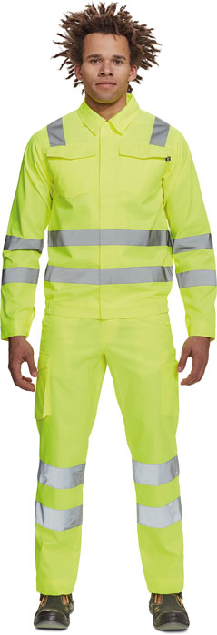 pánská full Hi-Vis pracovní bunda s retroreflexními pruhy přes ramena, v bocích a na rukávech, zapínání na zip kryté légou na suchý zip, 2 náprsní kapsy s klopou, nastavitelná šířka rukávů pomocí suchého zipu, elastický lem boků